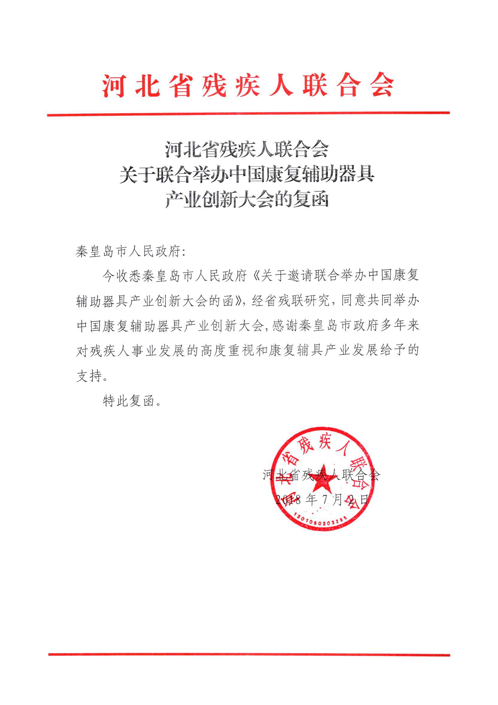 河北省残联关于共同举办大会的复函